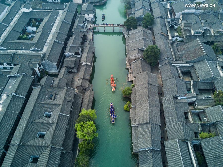 Aerial photo taken on March 29, 2017 shows a boat competition to celebrate the upcoming Sanyuesan Festival at Xizha scenic spot in Hangzhou, capital of East China's Zhejiang province. The Sanyuesan Festival is celebrated on the third day of the third lunar month. [Photo/Xinhua]