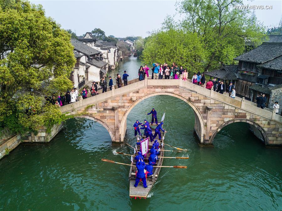 Aerial photo taken on March 29, 2017 shows a boat competition to celebrate the upcoming Sanyuesan Festival at Xizha scenic spot in Hangzhou, capital of East China's Zhejiang province. The Sanyuesan Festival is celebrated on the third day of the third lunar month. [Photo/Xinhua]