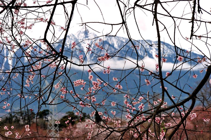Peach blossoms are pictured in front of a snow mountain in Bomi county, Southwest China's Tibet autonomous region, March 29, 2017.[Photo/Xinhua]