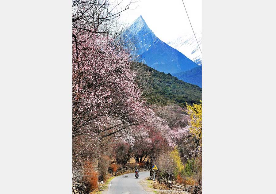Peach blossoms are pictured in front of a snow mountain in Bomi county, Southwest China's Tibet autonomous region, March 29, 2017.[Photo/Xinhua]