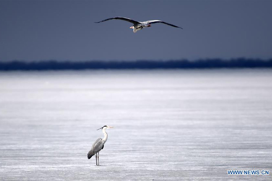 Herons rest on the remaining ice on Xingkai Lake, a border lake between China and Russia, in Northeast China's Heilongjiang province, March 30, 2017. Every day tens of thousands of migratory birds rest on Xingkai Lake on their way back to the north as the weather warms up. [Photo/Xinhua]
