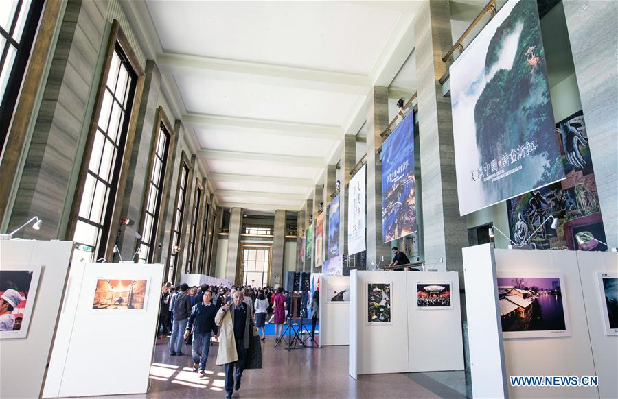 People visit the exhibition "Beautiful China, Picturesque Zhejiang" in Geneva, Switzerland, on April 19, 2017. The exhibition was held here on Wednesday as part of the activities marking the 2017 United Nations Chinese Language Day. [Photo/Xinhua]