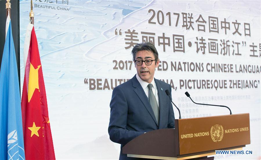 Francesco Pisano, Director of the UN Library in Geneva, addresses the inauguration of the exhibition "Beautiful China, Picturesque Zhejiang" in Geneva, Switzerland, on April 19, 2017. The exhibition was held here on Wednesday as part of the activities marking the 2017 United Nations Chinese Language Day. [Photo/Xinhua]