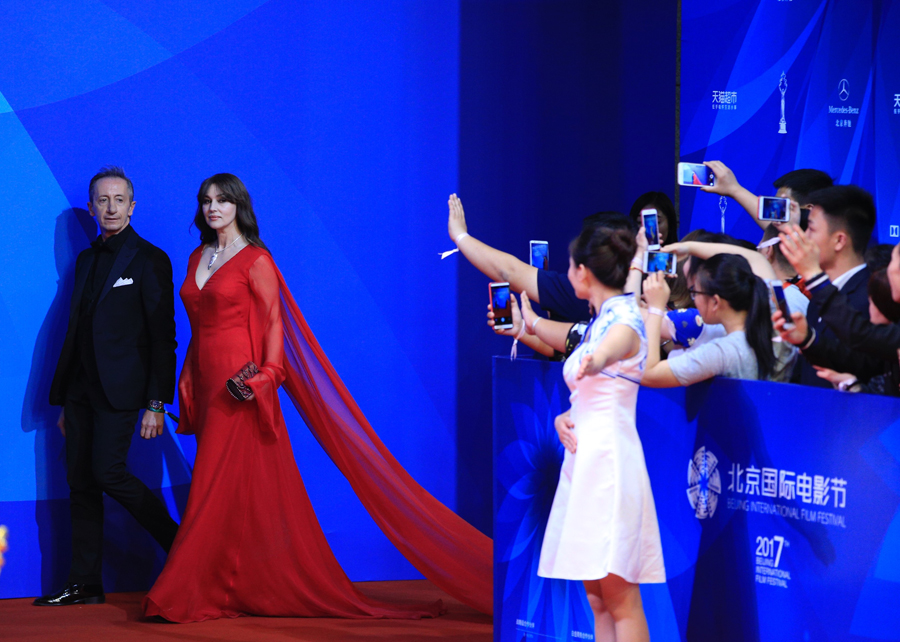 Monica Bellucci (center) walks the red carpet at the closing ceremony of the Beijing International Film Festival on Sunday. [Photo by Jiang Dong/China Daily]
