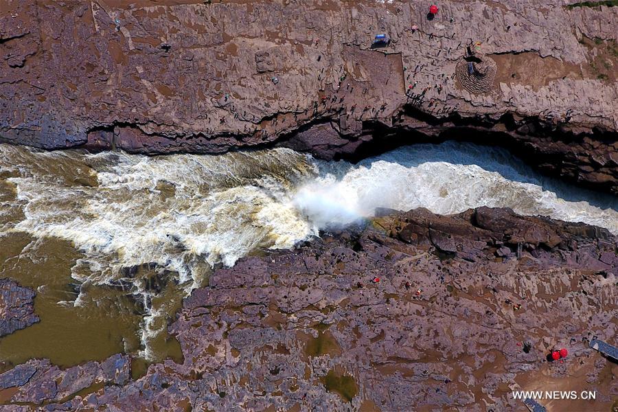 Aerial photo taken on May 23, 2017 shows the Hukou Waterfall of the Yellow River in Jixian county, North China's Shanxi province. [Photo/Xinhua]