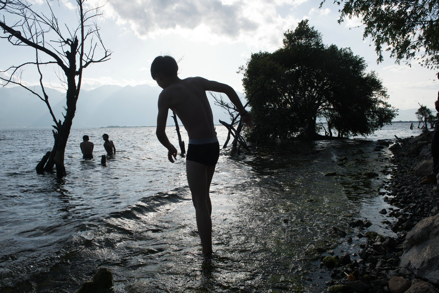 Some teenagers still swim in the lake, thinking little of the pollution. [Photo by Chen Liang/provided to China Daily]