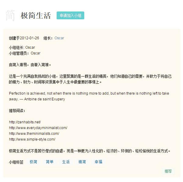 A Tianjin-based Douban user, Oscar, established the group that year and tried to share things about minimalism. Many users were inactive and rarely commented or posted in the group.