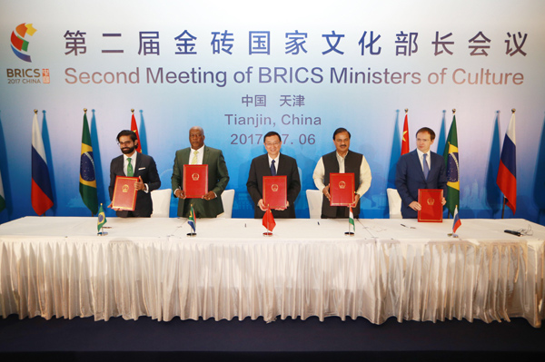 Representatives from BRICS countries ink an action plan on cultural cooperation during the second meeting of BRICS ministers of culture in Tianjin, north China, July 6, 2017. [Photo/Xinhua]