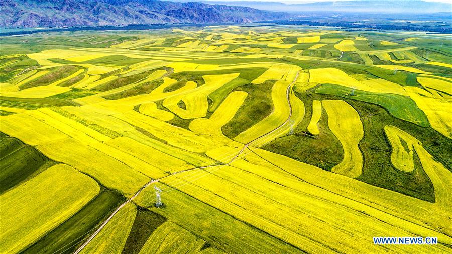 Aerial photo shows the view of cole flowers and wheat in Ili Kazakh autonomous prefecture, Northwest China's Xinjiang Uygur autonomous region, July 9, 2017. A total of 200,000 mu (about 3,2948 acres) of blooming cole flowers here attracted many tourists. [Photo/Xinhua]