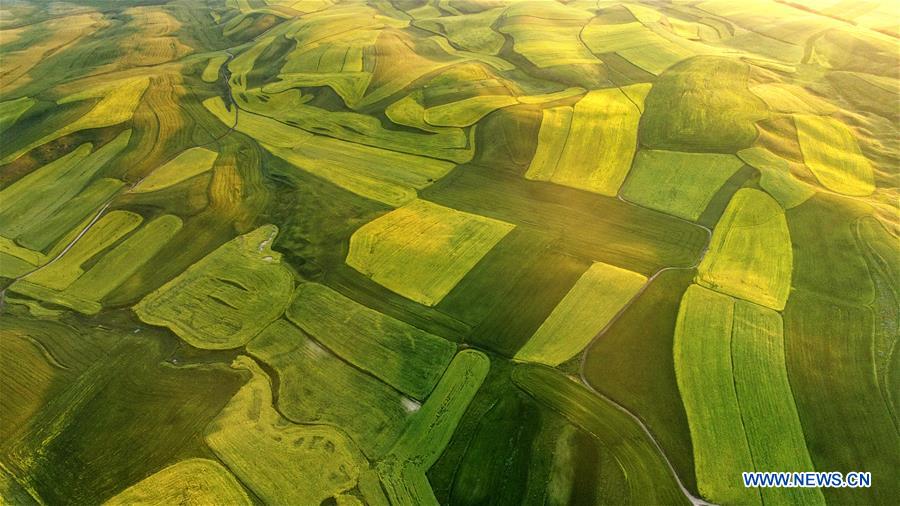 Aerial photo shows the view of cole flowers and wheat in Ili Kazakh autonomous prefecture, Northwest China's Xinjiang Uygur autonomous region, July 9, 2017. A total of 200,000 mu (about 3,2948 acres) of blooming cole flowers here attracted many tourists. [Photo/Xinhua]