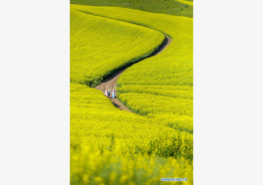 Aerial photo shows the view of cole flowers and wheat in Ili Kazakh autonomous prefecture, Northwest China's Xinjiang Uygur autonomous region, July 9, 2017. A total of 200,000 mu (about 3,2948 acres) of blooming cole flowers here attracted many tourists. [Photo/Xinhua]