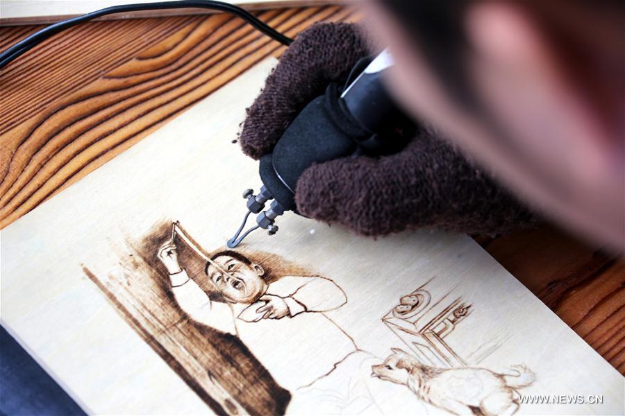 Folk artist He Yanbin performs pyrography during a competition about folk skills and stunts in Zaozhuang, East China's Shandong province, Sept 3, 2017. [Photo/Xinhua]
