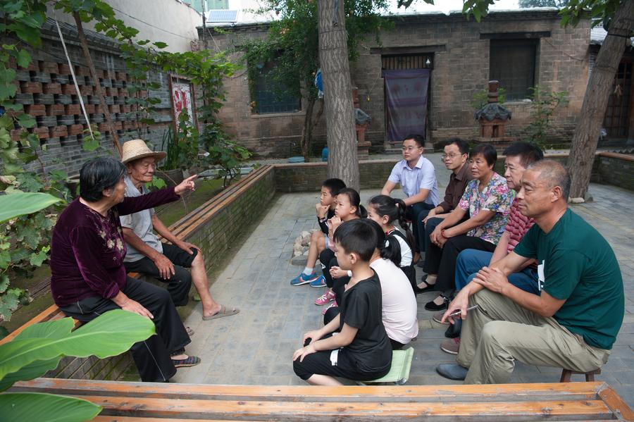 Villager Zhang Caicai and his wife Hou Guoguo tell stories in Gengcun village in Shijiazhuang, capital of North China's Hebei province, Sept 4, 2017. [Photo/Xinhua]