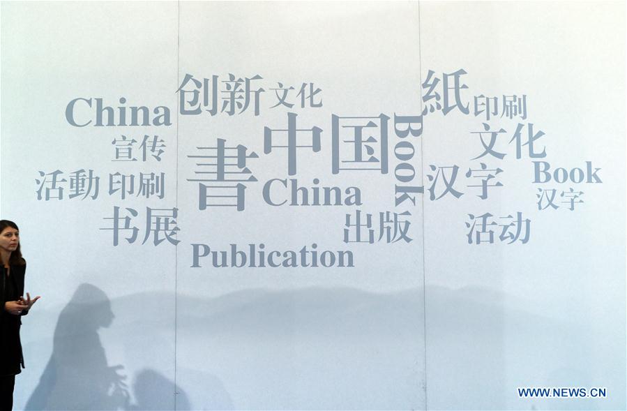 A woman walks past a board at the Chinese pavilion of the 69th Frankfurt Book Fair in Frankfurt, Germany, on Oct. 11, 2017. [Photo/Xinhua]