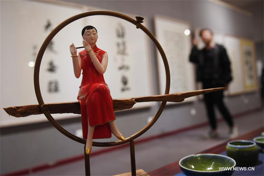 A visitor looks at an artwork during an exhibition at Changsha Normal University in Changsha, capital of Central China's Hunan province, Nov 11, 2017. An art exhibition was held at Changsha Normal University on Saturday, showcasing art creations by students from more than 30 universities and colleges. [Photo/Xinhua]