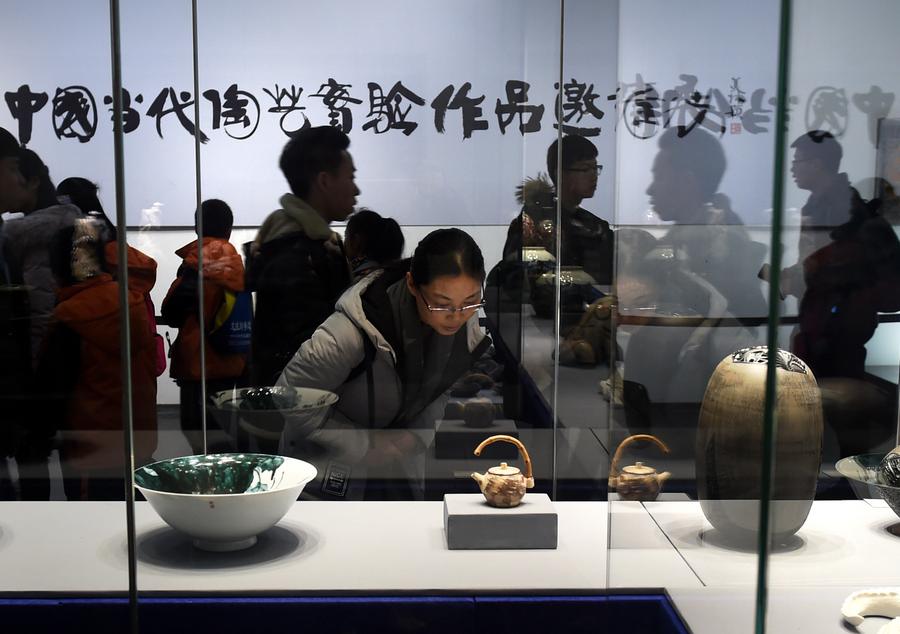 Visitors look at exhibits at a pottery exhibition in Shandong Museum in Jinan, capital of East China's Shandong province, Dec 9, 2017. Over 130 pottery works, made by artists from more than 30 colleges and universities in China, are displayed during the exhibition.[Photo/Xinhua]