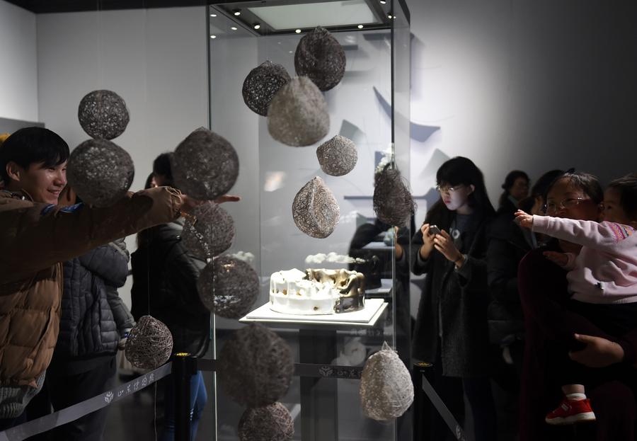 Visitors look at exhibits at a pottery exhibition in Shandong Museum in Jinan, capital of East China's Shandong province, Dec 9, 2017. Over 130 pottery works, made by artists from more than 30 colleges and universities in China, are displayed during the exhibition. [Photo/Xinhua]
