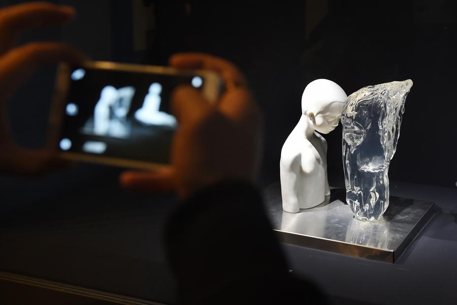 A visitor takes photos of an exhibit at a pottery exhibition in Shandong Museum in Jinan, capital of East China's Shandong province, Dec 9, 2017. Over 130 pottery works, made by artists from more than 30 colleges and universities in China, are displayed during the exhibition.[Photo/Xinhua]