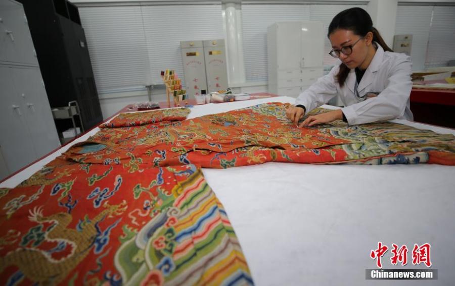 A worker repairs relics in the Relic Hospital at Beijing's Palace Museum in December, 2017. [Photo/China News Service]