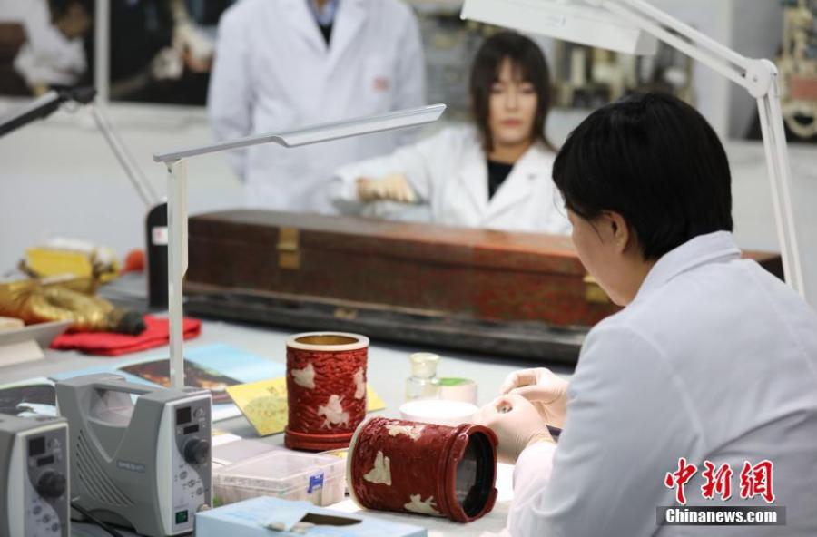 Workers repair relics in the Relic Hospital at Beijing's Palace Museum in December, 2017. [Photo/China News Service]
