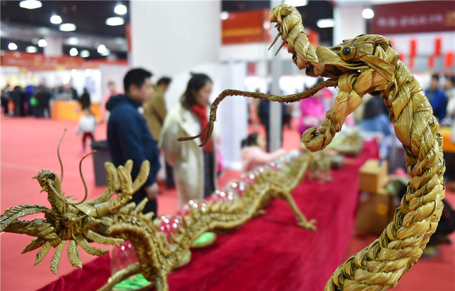 The handicraft of palm plaiting is on display during the expo in Luoyang , Henan province, Dec 9, 2017. [Photo by Huang Zhengwei/Asianewsphoto]