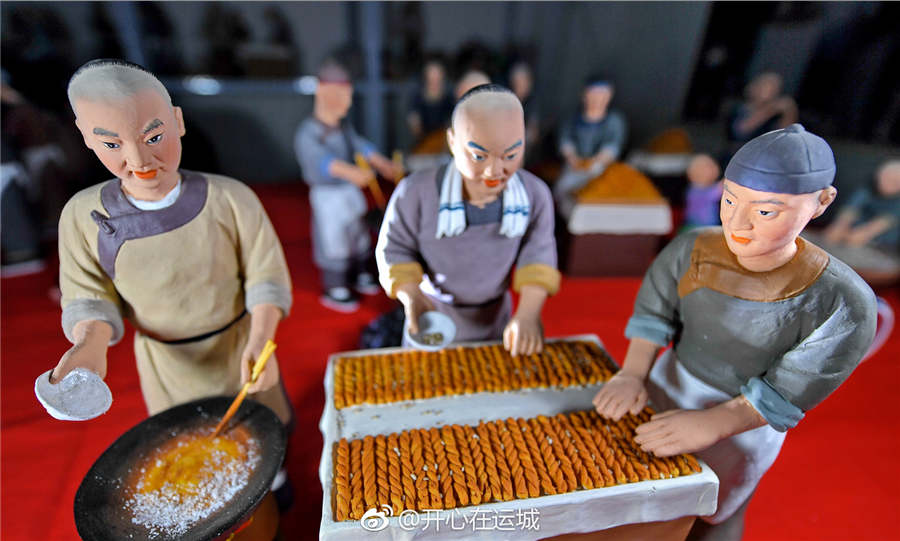 The clay sculptures made by folk artist Liang Hongzhi from Shanxi province show the making process of "Jishan fried dough twist". [Photo by Changkongjunwu/provided to chinadaily.com.cn]