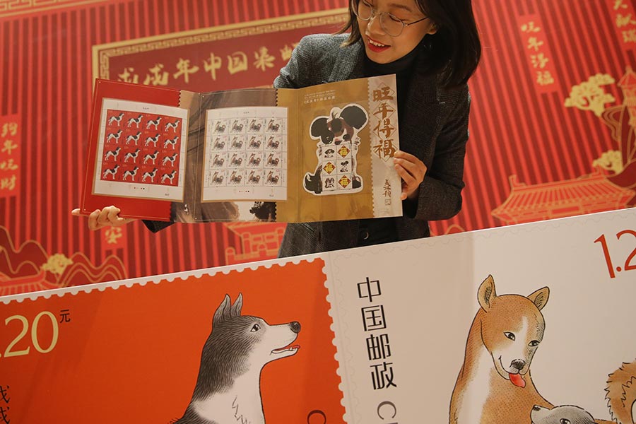 China Post will issue a set of two stamps celebrating the upcoming Chinese Year of the Dog on Jan 5. Each stamp will bear a face price of 1.2 yuan (18 US cents) and are due to be released nationwide. [Photo by Jiang Dong/China Daily]