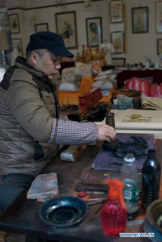 A printer prepares to print a piece of Jiajiang New Year Painting in Jiajiang county of Leshan city, Southwest China's Sichuan province, Dec 24, 2017. [Photo/Xinhua]