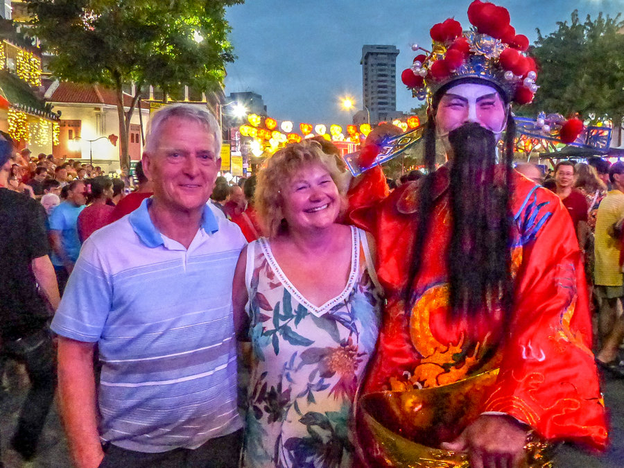 歡樂春節(jié)慶?;顒印缲?cái)神。[攝影:Hong Yew Kwong] Tourists take a photo with the God of Fortune during a New Year celebration in Singapore. [Photo by Hong Yew Kwong]