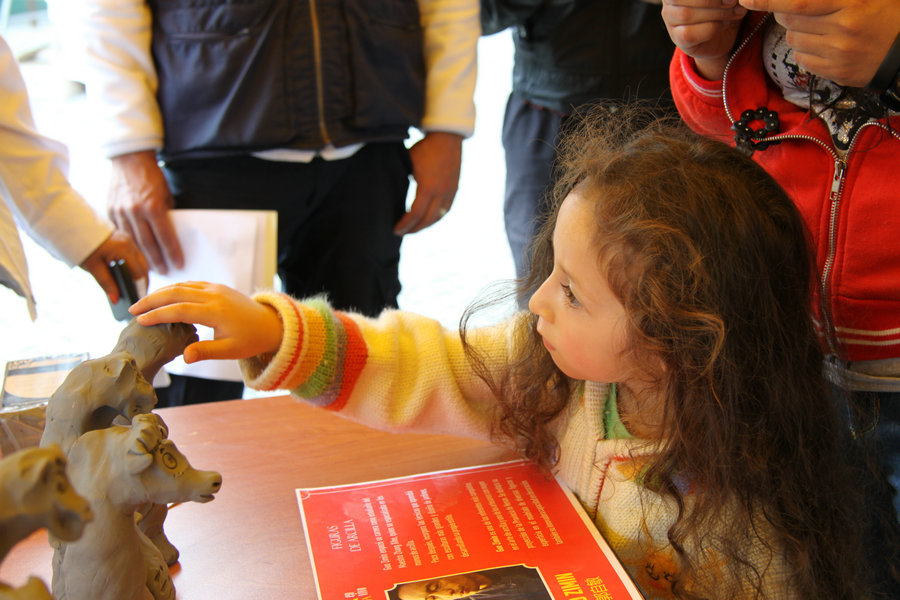 A child is attracted by clay figurines at a Chinese New Year celebration held at the Catedral de Sal in Zipaquira, Colombia, on Jan 28, 2017. [Photo by Yu Yiping]