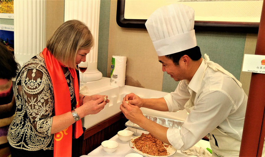 A local resident learns to make jiaozi with the help of a Chinese cook at a Chinese New Year celebration at the Chinese Embassy in Canada on Jan 25, 2017. [Photo by Lv Yongjiu]