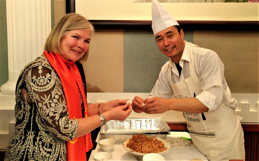 A local resident smiles when she finally learns how to make jiaozi with the help of a Chinese cook at a Chinese New Year celebration at the Chinese Embassy in Canada on Jan 25, 2017. [Photo by Lv Yongjiu]