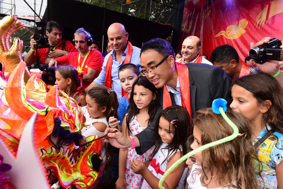 雞年“歡樂(lè)春節(jié)”在阿根廷精彩上演。[攝影:柳軍] Children celebrate Chinese New Year, in Argentina, by learning how to decorate a Chinese dragon at a temple fair. [Photo by Liu Jun]