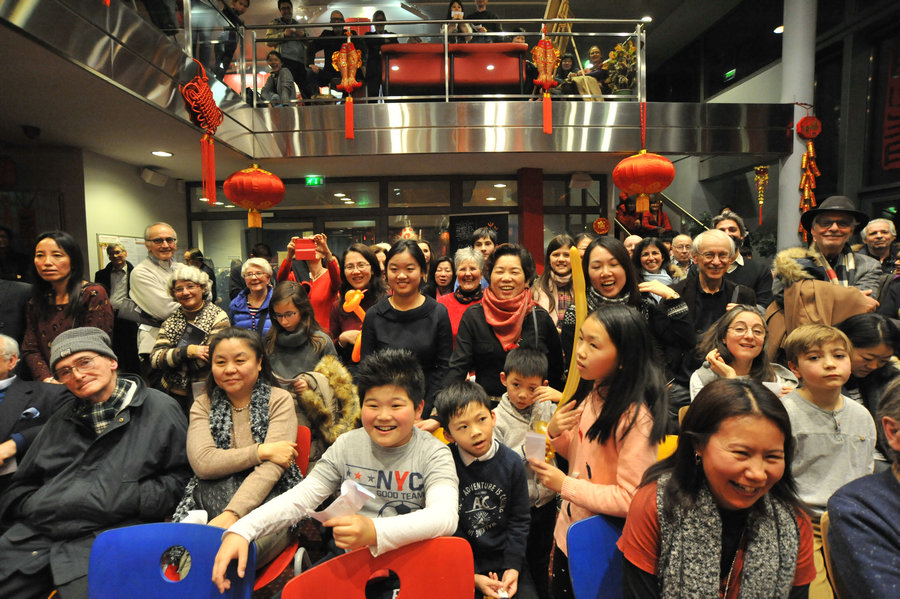 People, attending the Chinese New Year celebration at the China Cultural Center in Paris, get excited about the luck draw. The event was held on January 21, 2017. [Photo by Tu Xiong]