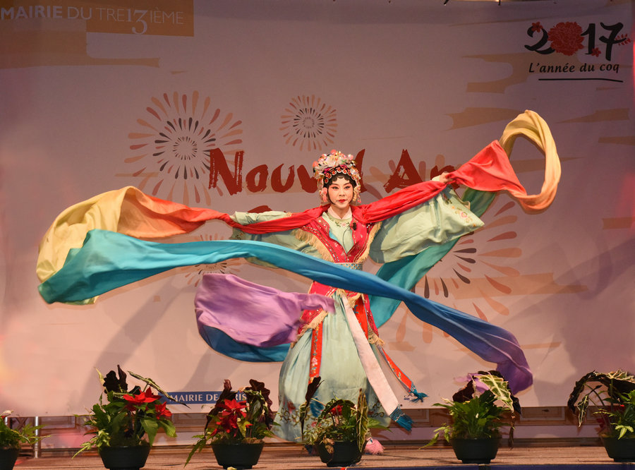 Suo Mingfang, a Peking Opera artist from the Jingju Theater Company of Beijing, performs parts of the famous Peking Opera play, titled The Heavenly Maids Scatter Blossoms, at a Chinese New Year celebration. The event was held in partnership, between the China Cultural Center in Paris and Paris’ Thirteen District Government, on January 25, 2017. [Photo by Tu Xiong]