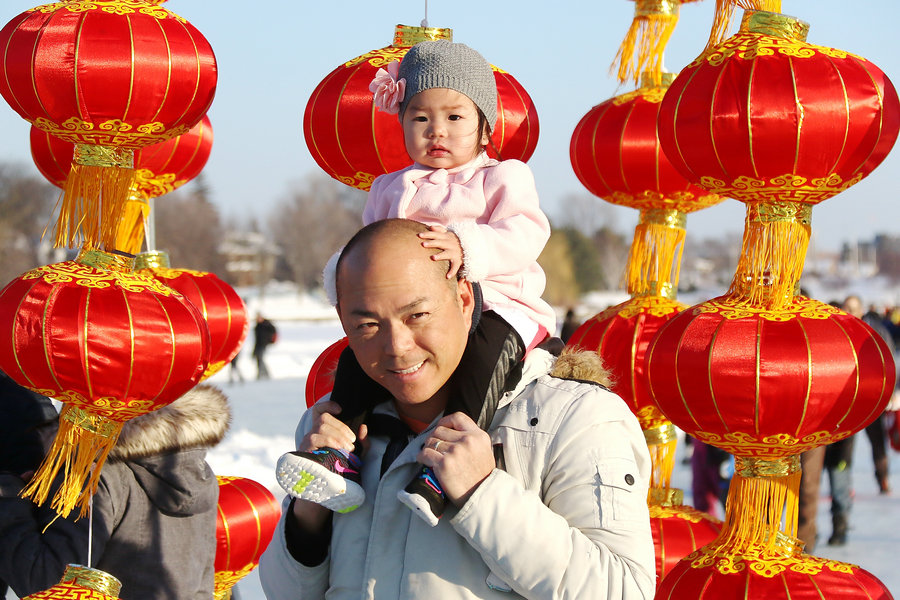 2017年2月17、18日,渥太華首屆冰上龍舟節(jié)于在 Dow's Lake 成功舉行,人們戴著象征歡樂春節(jié)的紅圍巾,參與龍舟比賽、觀看舞獅表演,在春節(jié)燈籠前與親友合影留念。[攝影:陳勇衛(wèi)]