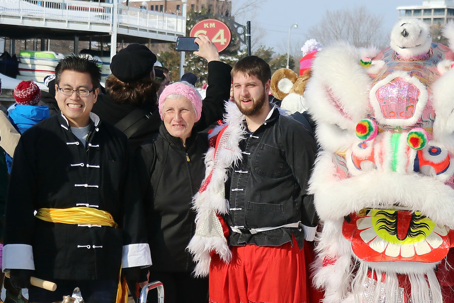 The first Ottawa Ice Dragon Boat Festival was held on February 17 and 18, 2017, at the Dow's Lake. People wearing Spring Festival scarves participated in the dragon boat contest, and took part in the lion dance, taking pictures with their families and friends on the joyful occasion. [Photo by Chen Yongwei]