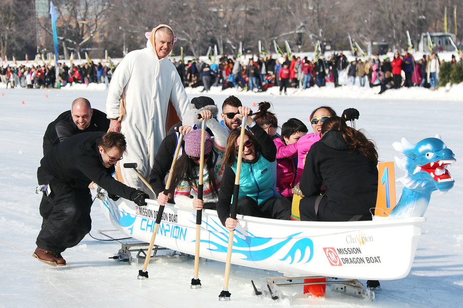 The First Ice Dragon Boat Festival was held on February 18, 2017, to celebrate the Chinese New Year, as well as the 150th anniversary of Canada. Wang Wentian, charge d'affaires of the Chinese Embassy in Canada, MélanieJoly, minister of Canadian Heritage, and officials and guests participated in the game. The Chinese Embassy and Canadian Foreign Ministry also formed a united team called Polar Pandas. [Photo by Chen Yongwei]