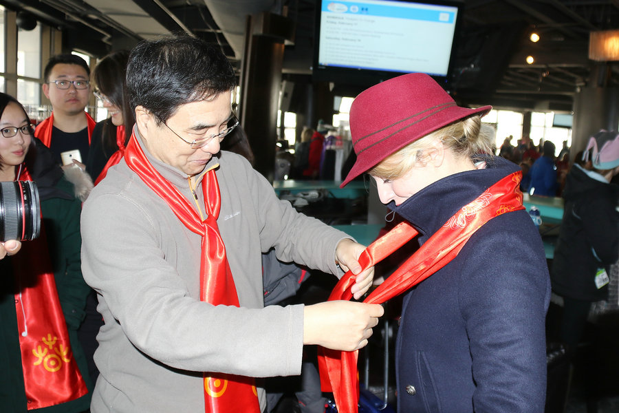 駐加拿大使館文化公參趙海生為加拿大文化部長(zhǎng)喬麗戴上象征快樂(lè)春節(jié)的紅圍巾