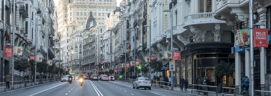 道旗招展—— “歡樂春節(jié)”道旗掛滿馬德里街頭,圖為馬德里市中心格蘭大道。[攝影:Adolfo Barroso Simon]