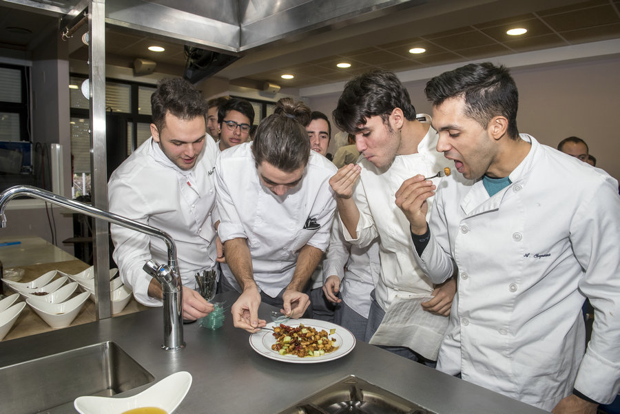 Sichuan chef Fu Haiyong opens a master class for local students in Madrid. Students taste a freshly cooked dish, called the Kung Pow Chicken. [Photo/Adolfo Barroso Simon]