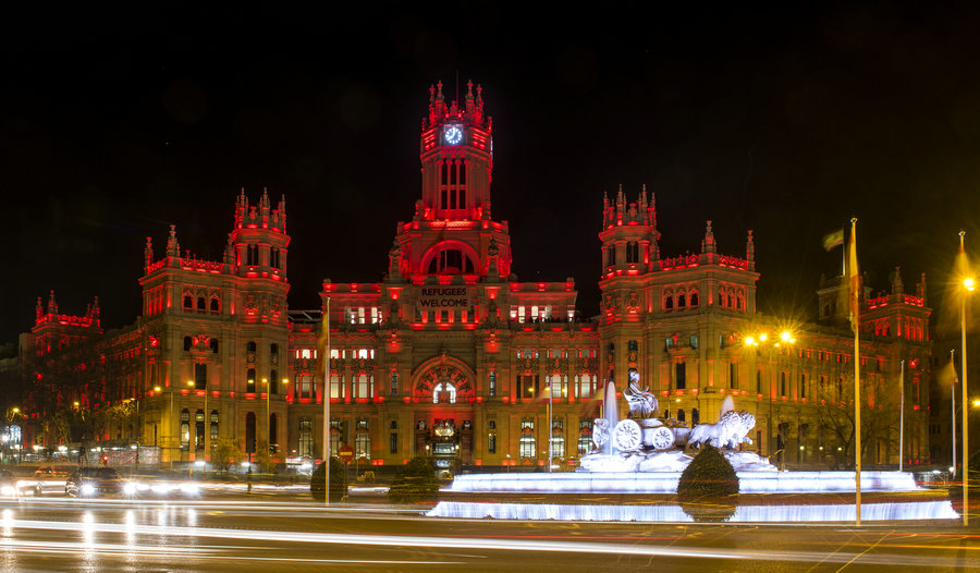 大地女神廣場的中國紅——春節(jié)期間,大地女神廣場(馬德里市政大樓)的夜間照明披上了中國國旗色。[攝影:Adolfo Barroso Simon]