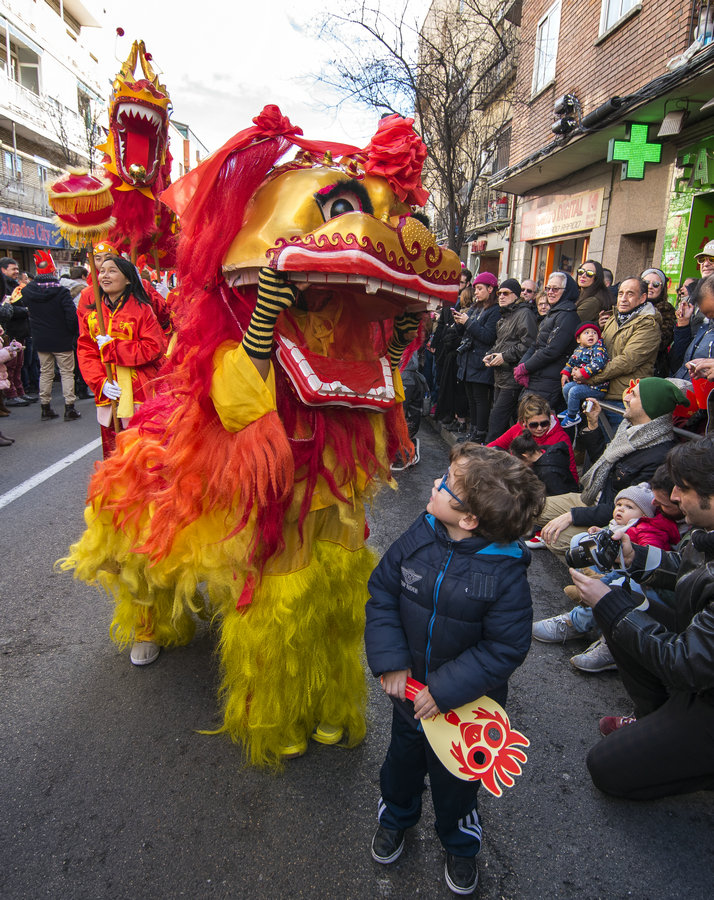 普天同慶——在西班牙“中國城”(Usera)的春節(jié)慶典上,舞龍舞獅方陣與西班牙民眾互動。[攝影:Adolfo Barroso Simon]