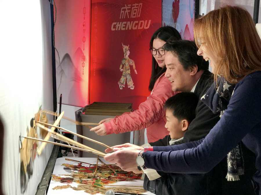 The 2017 Happy Chinese New Year press conference, as well as the opening ceremony of Chengdu Culture Week, took place at the Madrid Cultural Center on Jan 13. Guests and visitors learn to perform a shadow puppet show. [Photo/Chen Guangyu]