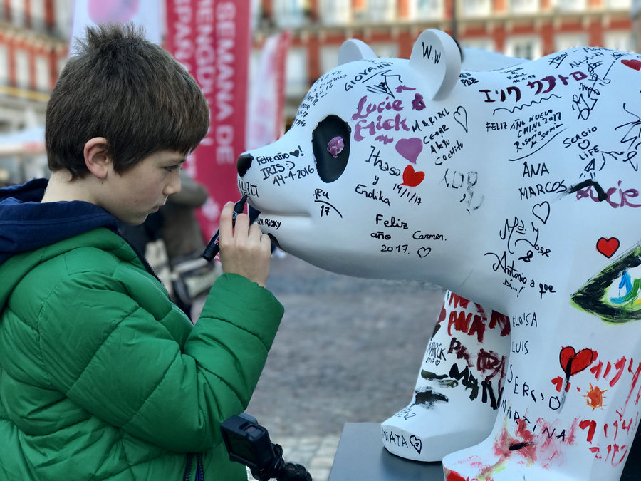 A boy writes on the panda mascot to send Chinese New Year greetings. [Photo/Chen Guangyu]