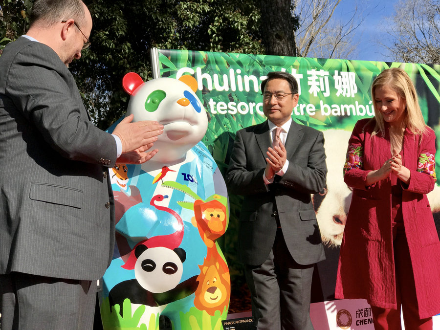 The birth of Chulina: Cristina Cifuentes (right), president of the Community of Madrid and Lyu Fan, the ambassador of the People's Republic of China to Spain, standing next to her, unveil a sculpture of Chulina at the Madrid Zoo Aquarium on Jan 12, 2017. [Photo/Chen Guangyu]