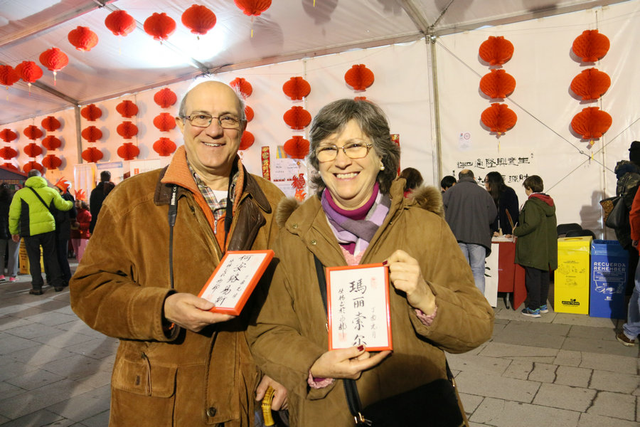 Calligraphy is an indispensable part of Chinese cultural exchange events. People in Spain show the results of a Chinese calligrapher transliterating their names into Chinese and writing them on Xuan paper as a token of cultural communication. [Photo/Tang Shangyan]