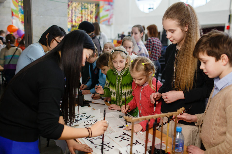 白俄羅斯明斯克,歡樂春節(jié)文化廟會(huì)期間,孩子們拿起毛筆與孔子學(xué)院的老師們學(xué)寫中國字。[攝影:明斯克中國文化中心]