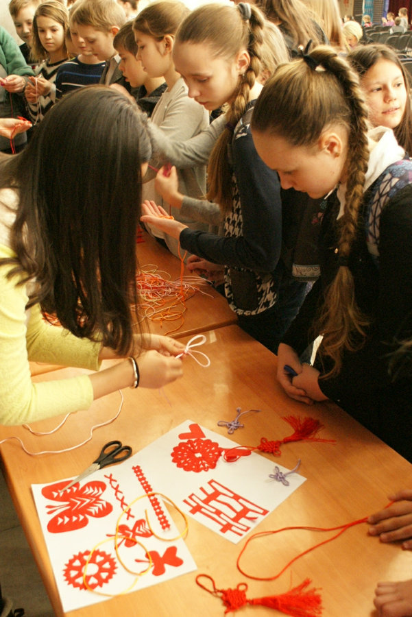 歡樂春節(jié)新春廟會上,孩子們和老師學(xué)習(xí)著編中國節(jié),這也是他們近距離地體驗歡樂無窮的“中國節(jié)”。[攝影:中國駐白俄羅斯大使館]