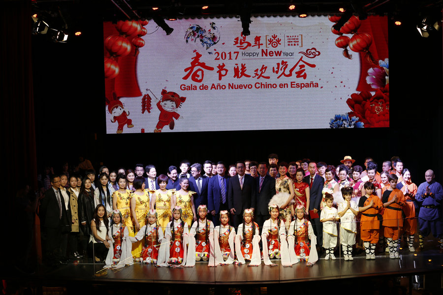 Lyv Fan, the Chinese ambassador to Spain, takes a photo with performers of the 2017 Chinese New Year Gala. [Photo/Gang Qi]
